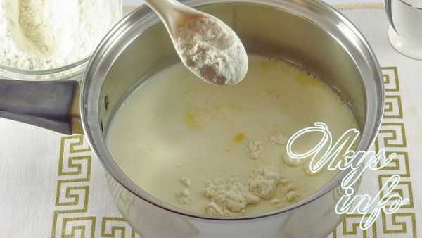 - Добавьте муку, желательно ее просеять, чтобы насытить кислородом. Царские блины должны получиться пышными и мягкими. Не забудьте посолить.