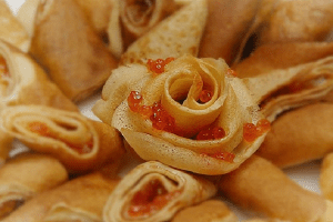 Есть также и более хитрые способы формовки блинов, вроде сворачивания блинов в бутоны и выкладывания икринок поверх. Если вы не знаете, как завернуть блины с икрой розочкой, то нет ничего проще: сложите блин и разрежьте его пополам, каждая из половинок будет представлять собой треугольник, который необходимо будет завернуть в трубочку. Узкую часть основания бутона выверните наверх, таким образом она зафиксирует «лепестки» вместе и не даст бутону распасться. Остается выложить порцию икры и можно сервировать.