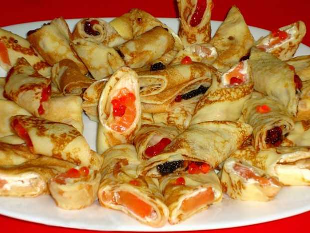 Как завернуть красиво блины с икрой?Самый простой и наиболее часто применяемый способ, свернуть блины рулетики или трубочками.