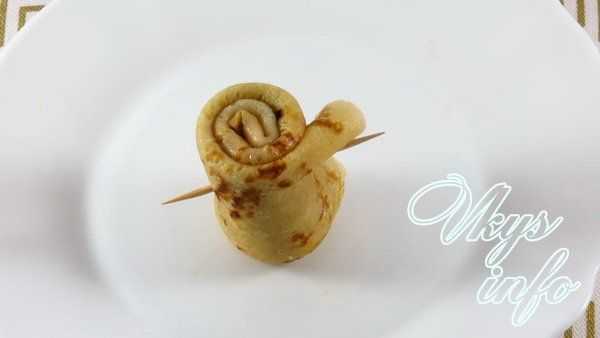 Блин вначале сворачиваем трубочкой (внутрь можно положить сливочный сыр или смазать сметаной), а потом плотно скручиваем от одного края к другому, как улитку. Скрепляем шпажкой.