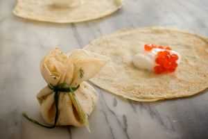 Еще один способ того, как можно красиво завернуть блины с икрой – простой мешочек, края которого зафиксированы вместе перышком зеленого лука. В центр блина можно выложить одну лишь икру или положить рядом с ней порцию сметаны или зелень. Соберите все края блина вместе и свяжите вместе перышком зеленого лука.