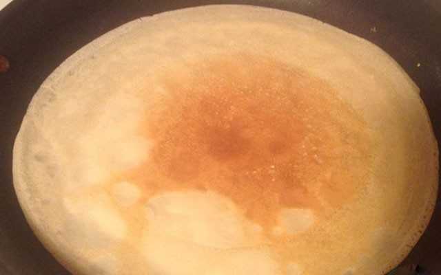 - Разогрейте антипригарную сковороду (25 см.) на среднем огне, смажьте сливочным маслом. В блинное тесто вмешайте 2 ст. л. растопленного масла (тесто будет выглядеть немного зернистым, но это нормально). Налейте в сковороду 1/4 ст. теста и вращайте, чтобы покрыть дно. Готовьте блин на среднем огне около 30 сек., пока поверхность не будет выглядеть сухой, а края начнут закручиваться. Переверните блин пальцами или лопаткой и готовьте до появления коричневых пятен, около 15 сек. Переложите на решетку для остывания. Повторите с оставшимся тестом, чтобы получилось 12 блинов (их можно сложить друг на друга на решетке после остывания). Блины можно поставить в холодильник на ночь завернутыми в пленку.