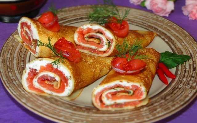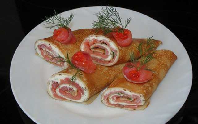 Мы уже давно привыкли, что многие хозяюшки на закуску подают нарезку рулета, сформированного из лаваша. А чем же наши русские блины хуже пресной тонкой лепешки?