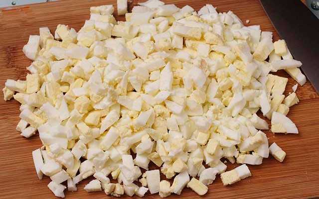 3. Вареные очищенные от скорлупок яйца крошим ножом в аналогичной форме или же измельчаем специальной сеточкой. Размер нарезки желательно сделать такой же, но даже если получится чуть меньше – ничего страшного.