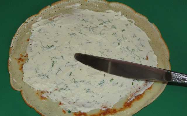 6. Распределяем по кругляшу творожно-рыбную начинку. Слегка подворачиваем два противоположных края и скатываем нашу «конструкцию» в виде «сигары».