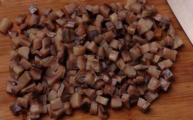 2. Селедку хорошо промываем, очищаем от косточек и пленок, чтобы филе у нас получилось абсолютно чистое. Нарезаем его сантиметровыми кубиками.
