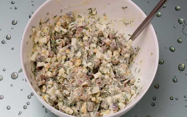 Последние пару лет стали очень популярны блины, которые начиняются целой «салатной смесью» на базе обычной селедки, яиц и зелени.