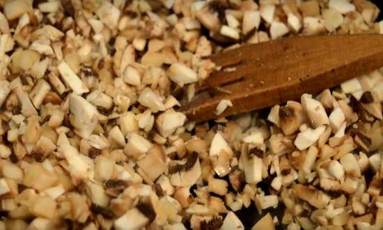 Для приготовления фарша необходимо мелко нарезать отварную куриную грудку, сначала вдоль волокон затем поперек. Добавить к фаршу ложку майонеза, пассированный лук и маринованные или предварительно прожаренные на сковороде грибы.