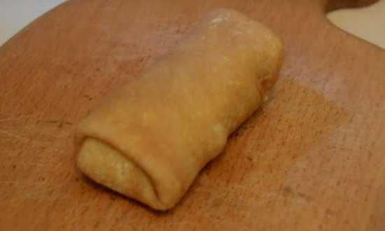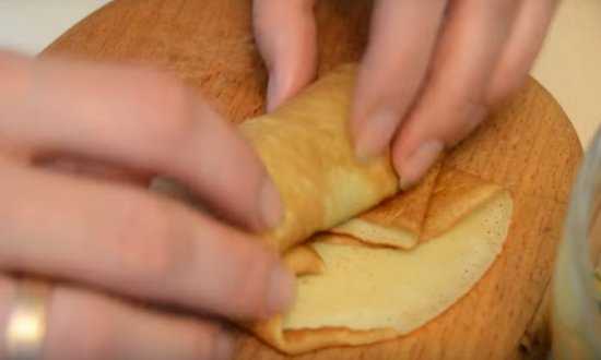 - Теперь блинчик с начинкой свернуть трубочкой.