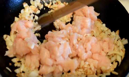 Далее добавляем филе курицы, жарим с луком около 5-6 минут