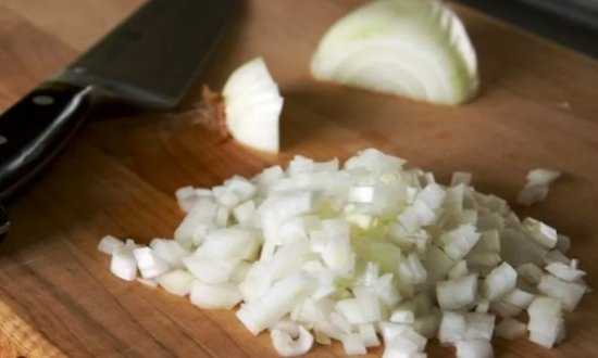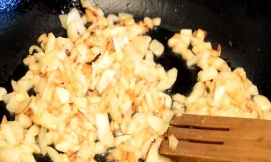 - Обжарьте фарш с добавлением лука – нашинкуйте его мелкими кубиками, перца и соли.