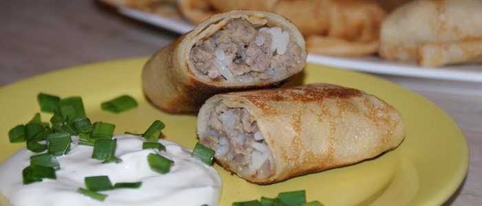 Рис помогает немного сэкономить на фарше не в ущерб вкусу. В итоге блины получаются нежными и сытными. Такое блюдо может заменить горячее. Выпекать блины можно, взяв за основу предыдущий рецепт.