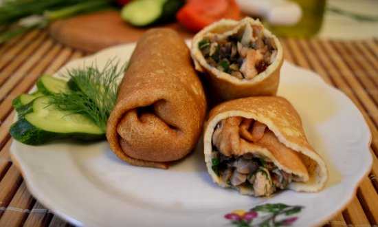 Куриное мясо идеально сочетается с грибами. Для фаршированных блинчиков можно использовать, как свежемороженые, так и маринованные грибы, лучше, если это будут шампиньоны.