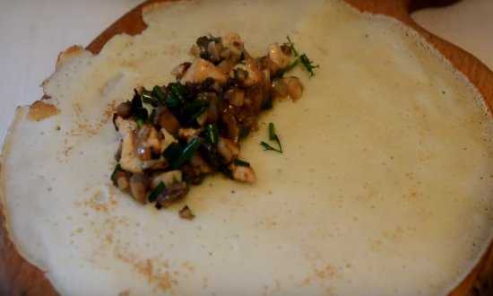 - Выкладывайте начинку в центр блина, заворачивайте их в конверт.