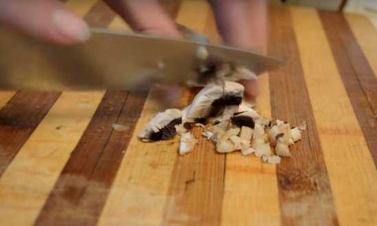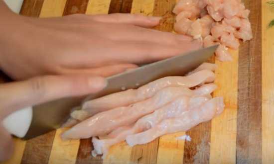 Нарезаем острым ножом сырое куриное филе на мелкие кусочки