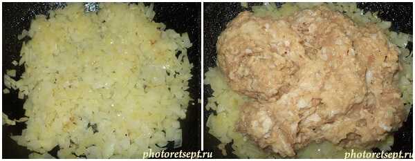 2. На разогретую сковороду с растительным маслом выкладываем нарезанный лук. Обжариваем его до полуготовности и добавляем куриный фарш.