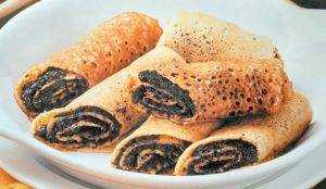 - На каждый блинчик равномерно нанести начинку и свернуть рулетиком. Блинчики с маковой начинкой готовы. Приятного аппетита!