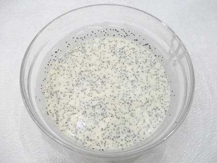 - Мак следует залить горячей водой (лучше всего кипятком), оставьте его постоять 30 минут, чтобы он разбух и стал мягче. Накройте емкость с маком блюдцем или же крышкой.
