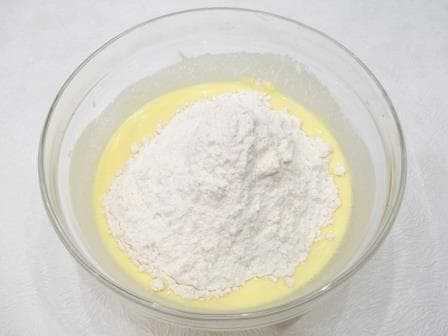 В молочно-желтковую смесь добавляем измельчённый миндаль и крахмал, перемешиваем.
