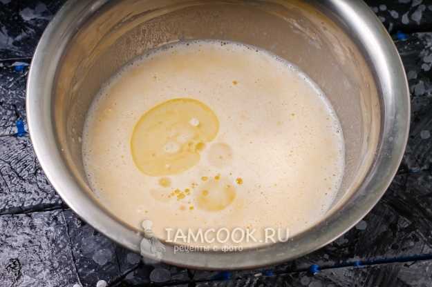 Оставляем тесто минут на десять, после чего добавляем растопленное масло, оно к этому моменту уже остынет.