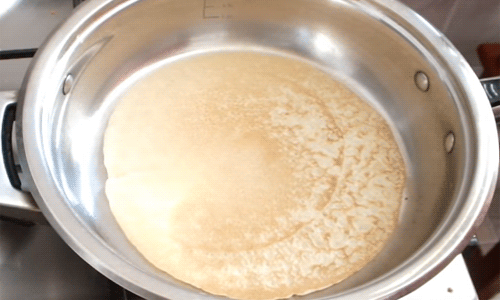 - Наливают немного теста, распределяя его равномерно по всей поверхности днища сковородки.