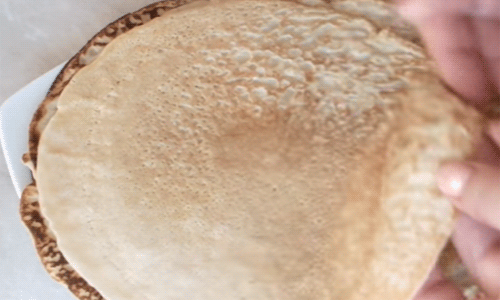 5. Разогрейте сковороду, смажьте растительным маслом. Налейте порцию теста, и вы увидите как на поверхности появятся дырочки. Выпекайте с двух сторон до румяности.