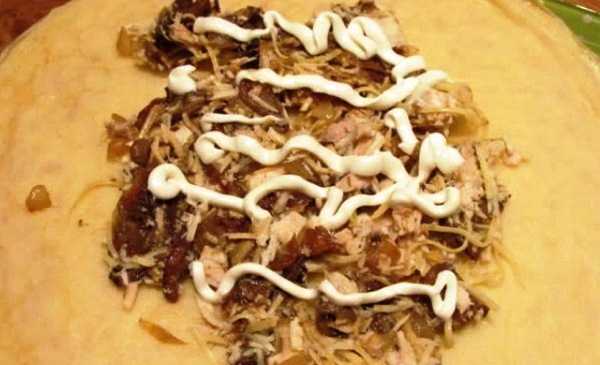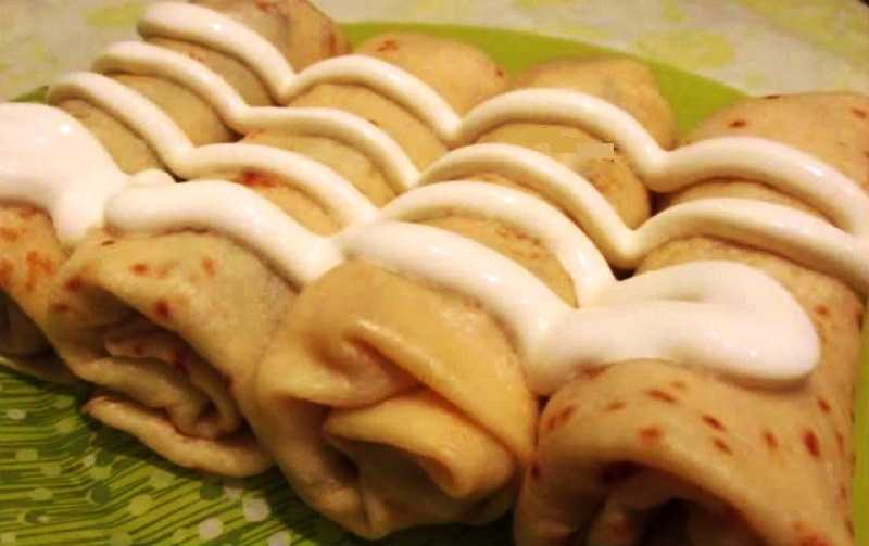 5. Выкладываем получившуюся начинку на готовые блинчики и слегка (при желании) поливаем майонезом для сочности.