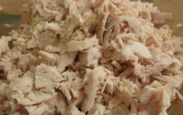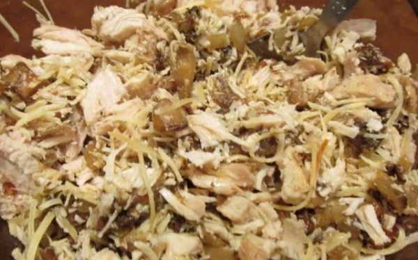 4. Смешиваем все составляющие — курицу, сыр и грибы.