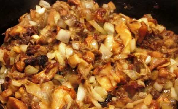 3. Свежие или замороженные грибы промываем, нарезаем и обжариваем на сковороде. В самом конце вводим к ним лук и доводим до готовности.