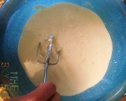 - Подогреть молоко до теплого состояния. Добавить в молоко яйца, посолить. Ввести частями муку, тщательно перемешивая, чтобы получилось однородное тесто.