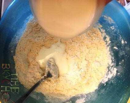 Вливаем тонкой струйкой кефир и продолжаем перемешивать. Добавляем воду.