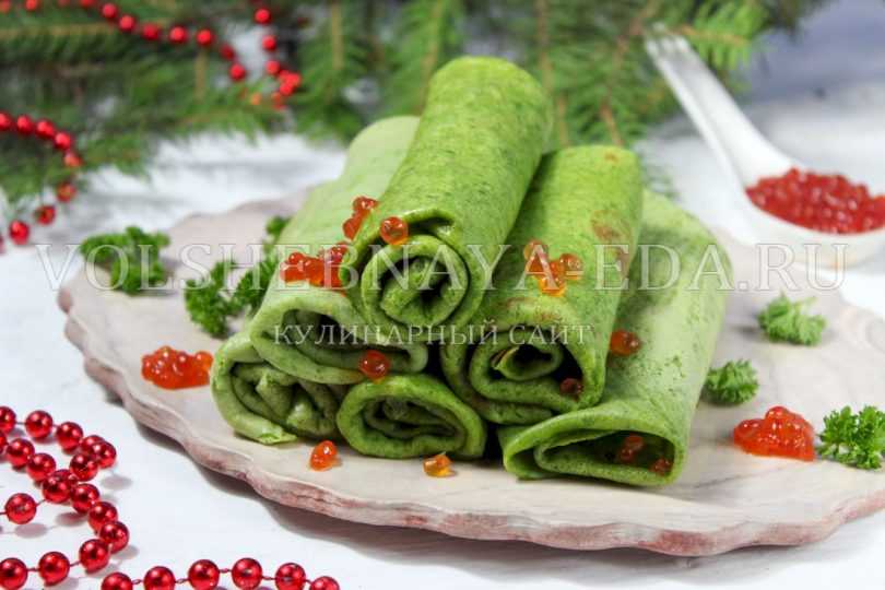 Больше яркого цвета и изысков на новогоднем столе! Давайте приготовим ярко-зеленые шпинатные блины с начинкой из крем-сыра и красной рыбы, получим удовольствие сами и доставим радость гостям! Зеленый — цвет здоровья и гармонии, кстати.