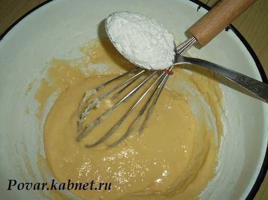 2) Во взбитые яйца с сахаром , подсыпаем по одной соловой ложки муки и постоянно мешаем, при помощи венчика. Должно получиться густое тесто, чтоб тяжело было перемешивать.