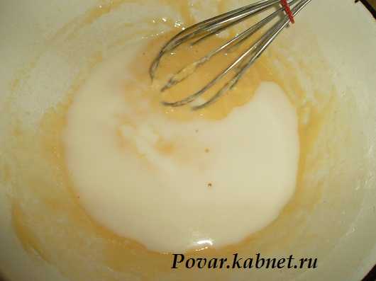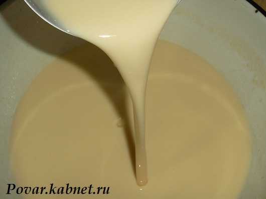 3) Теперь постепенно вливаем молоко, тонкой струйкой и тщательно размешиваем. Делаем это до тех пор, пока тесто не приобретёт жидкую консистенцию.