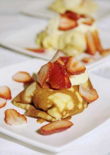 - 3 Начините блинчики фруктовой сальсой. По желанию можно украсить блюдо взбитыми сливками и свежими ягодами.