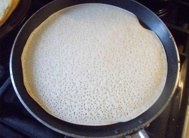 - Перед каждой новой частью теста, наливаемой в сковородку, её надо помаслить подсолнечным маслицем. Таким образом пласт с легкостью будет переворачиваться и на нём возникают дырочки которые так тяжело добиться.