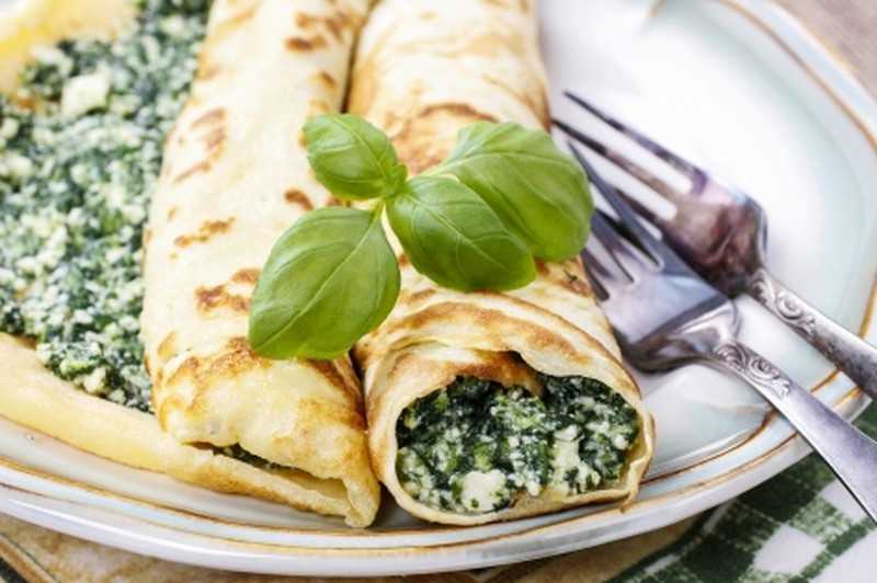 - 3 Для того, чтобы начинить предварительно приготовленные блины, смешайте лук и шпинат, добавьте творожный сыр. Хорошо перемешайте. Блинчик с начинкой сверните в ролл.