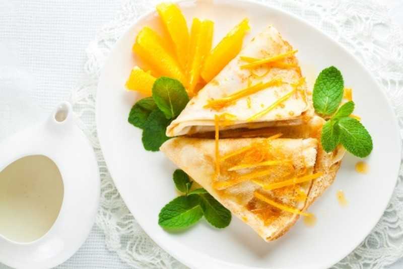 - 3 На тарелку нанесите апельсиновый сироп. Уложите блины — по три штуку на каждую тарелку. Выложите сверху апельсиновую массу и цедру, украсьте листьями свежей мяты.