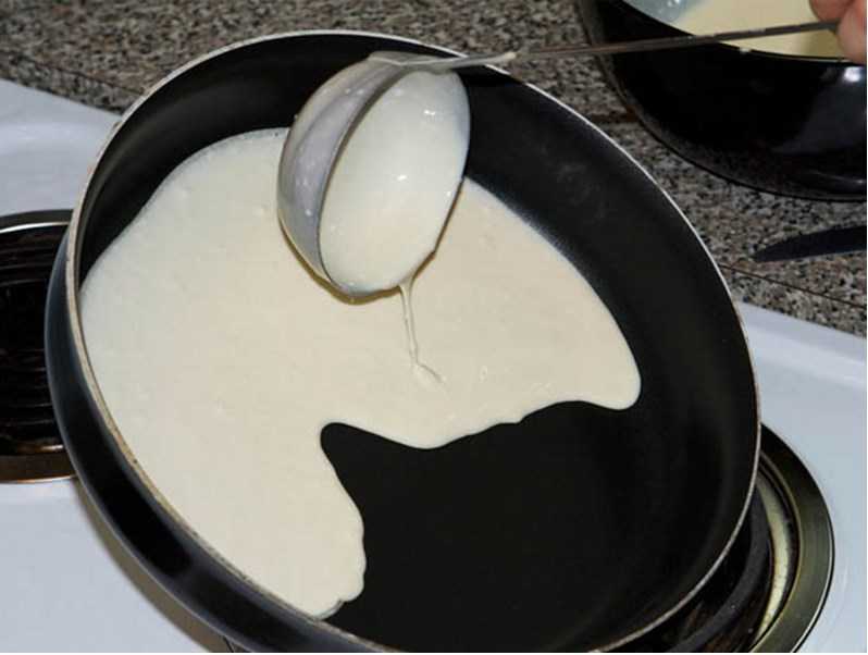- Перед каждой дозой теста, которое мы наливаем в сковородку, его полагается мешать. Для того, чтоб мука не проседала.