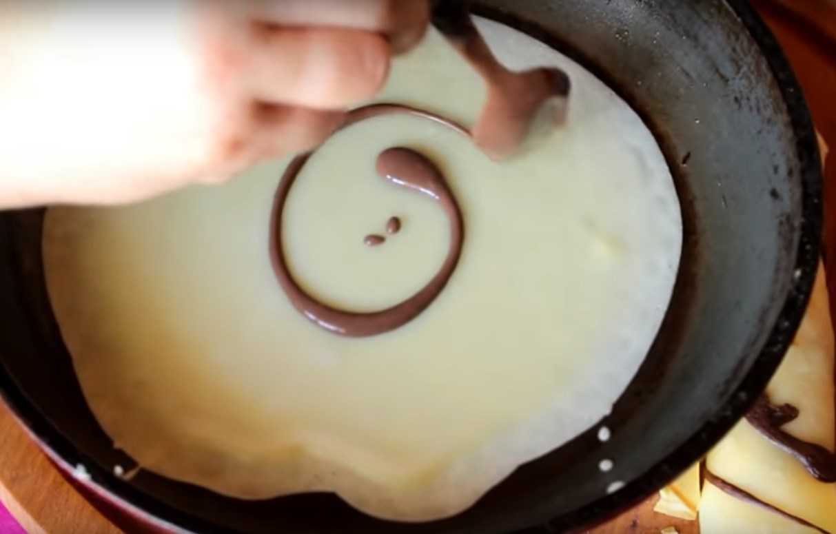 - Теперь, предварительно залив в чайничек с носиком шоколадное тесто нужно вливать коричневую массу сверху белого блина. При этом шоколадное тесто вливается так, чтобы на белом блинчике образовались коричневые кольца.