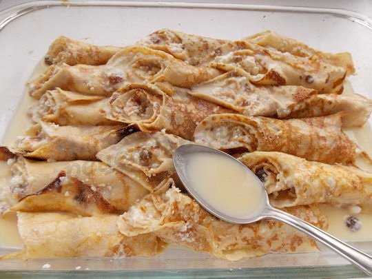 Заливаем блинчики – лучше не из миски, а из ложки, чтобы заливка равномерно распределилась.