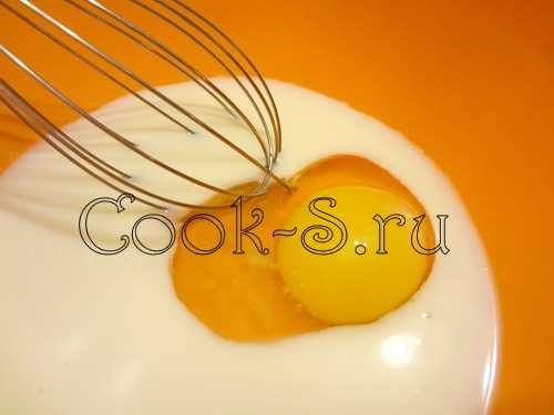 Тесто готовится следующим образом: в глубокую посуду выливаем все коровье или козье молоко. Разбиваем куриное яйцо и разбалтываем венчиком. Чтобы тесто имело вкус, необходимо добавить 1 ч.л. сахарного песка и 0,25 ч.л. поваренной или морской соли.