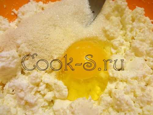 Творог смешать с яйцом, сахаром, манкой и ванилью.