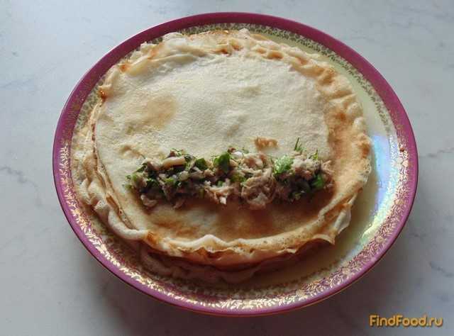Теплый блин положите на ровную поверхность, и разложите начинку средним слоем. На одну основу уходит примерно 1-2 ст.л. массы из печени.