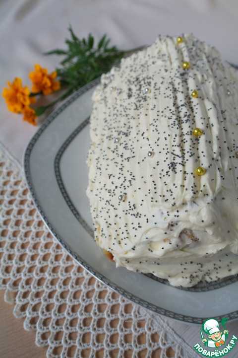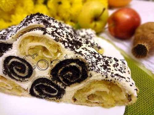 Обмазать три рулета первого ряда сладкой творожной массой. Сверху посредине положить два маковых рулета и снова смазать их творогом.
