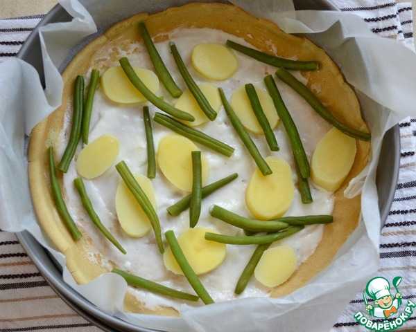 Смазываем форму для запекания подсолнечным маслом и выкладываем блинчики «черепицей», то есть немного внахлёст: первый ряд на дно формы, затем второй ряд так, чтобы он чуть накладывался первый, и так далее. Я запекала в форме 35х25 см, но можно и в меньшей – тогда блинчики будут умещаться компактней, потому что в этой форме они лежали весьма свободно.