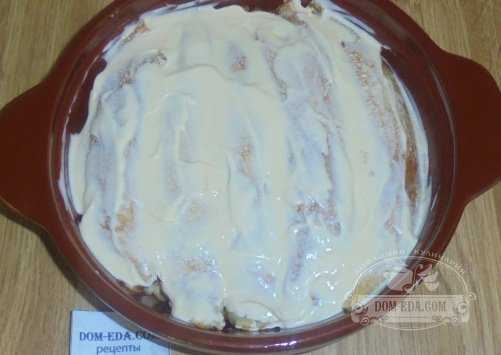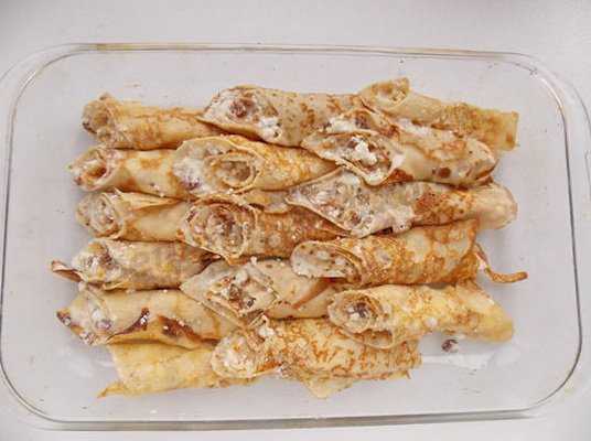 Залить сметано — яичной массой блины.