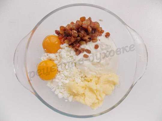 Творог, желательно протёртый, смешиваем со взбитым маслом, двумя желтками, сметаной и изюмом. Промытый изюмчик предварительно хорошо бы запарить тёплой водой, пусть постоит минут 10, размягчится, а затем водичку можно выпить, а изюм, как следует отжав, добавить в начинку. Перемешиваем ингредиенты.