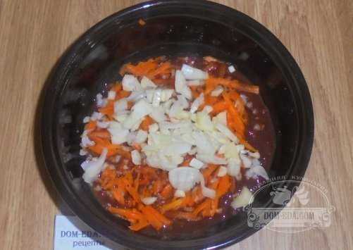 Репчатый лук и чеснок необходимо нарезать мелко с помощью ножа. Добавить и перемешать до однородности.