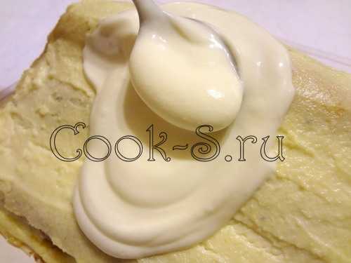 Промажьте их сверху хорошим слоем жирной сметаны – лучше домашней. Можно еще промазать дно посуды, в которой готовится блюдо. Майонез используйте на свое усмотрение, либо сливки.